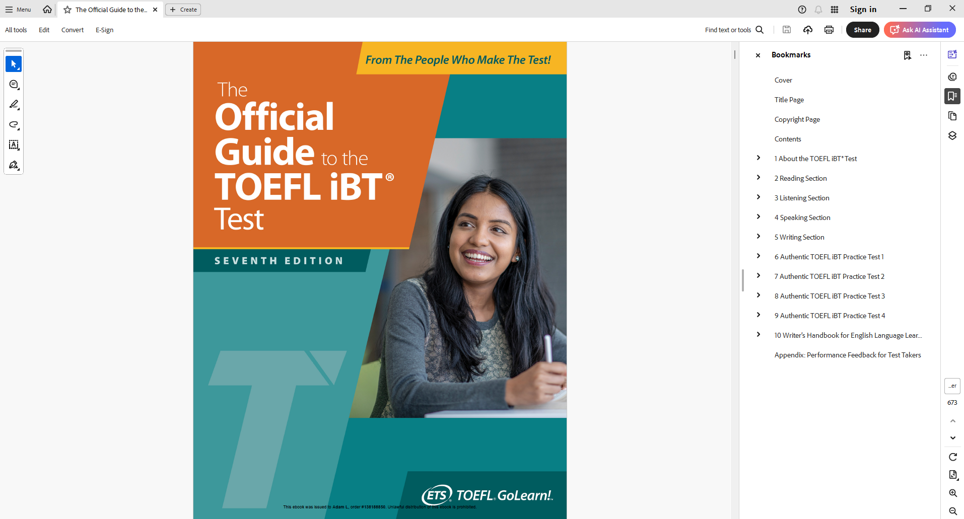 For sale is The Official Guide to the TOEFL iBT Test, Seventh Edition (Official Guide to the Toefl Test)